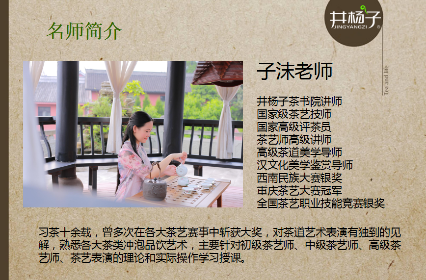 针对重庆及西南地区茶友,井杨子推出了生活茶艺兴趣班、高等级茶艺进阶班、雅致茶道研修班三种茶艺培训课程,零基础教学、随到随学、免费复习!